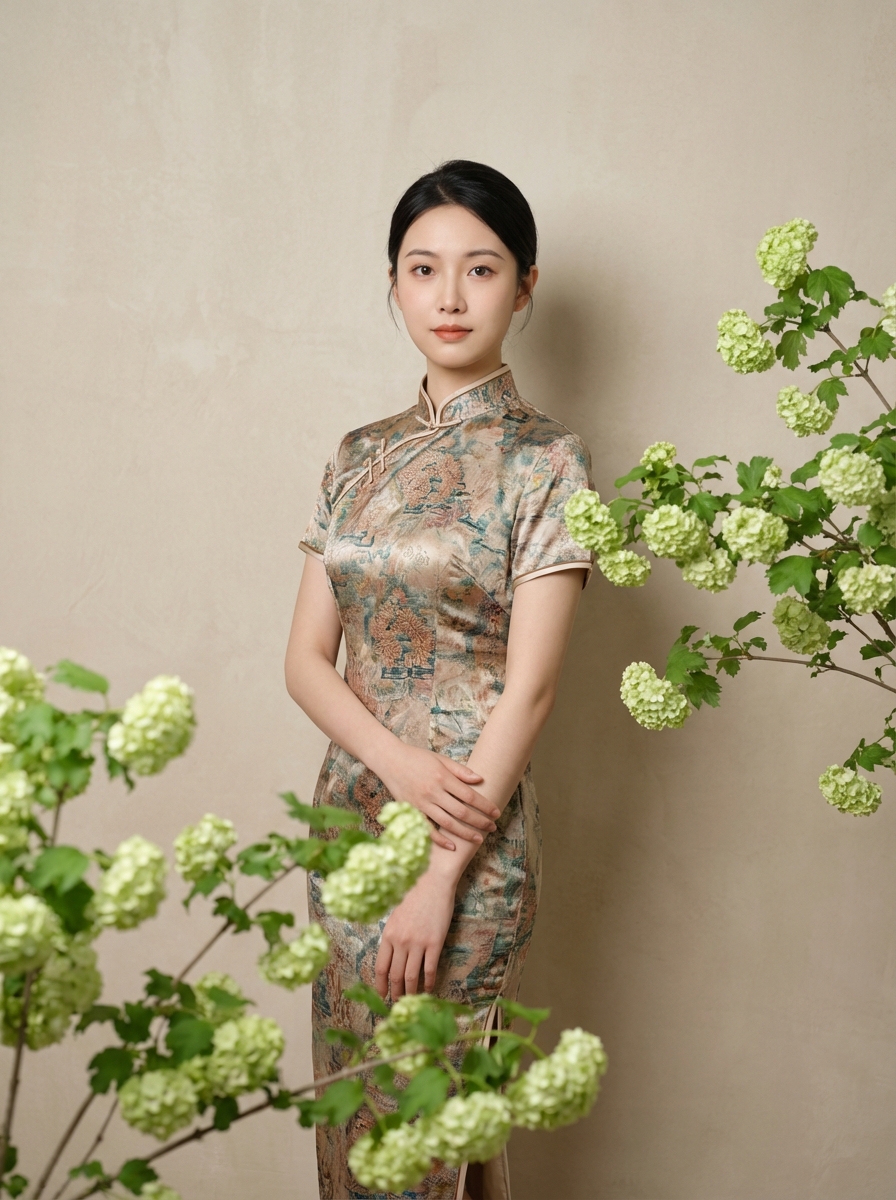 {"core_structure": {"description": "A serene studio portrait of a young East wearing a cheongsam, framed by and green cluster flowers.", "elements": [{"object": "young model", "attributes": ["East ", "smooth dark hair pulled back", "natural minimal makeup", "gentle direct gaze", "elegant posture"]}, {"object": "Attire", "attributes": ["cheongsam (qipao)", "subtle tonal embroidery patterns", "high mandarin collar", "cap sleeves"]}, {"object": "Botanical Elements", "attributes": ["branches of snowball viburnum or hydrangea", "small and light green flower clusters", "placed in foreground and right side"]}, {"object": "Background", "attributes": ["neutral beige textured wall", "plain and out of focus"]}]}, "style_definition": {"primary_style": "photorealistic | studio portrait | contemporary elegance", "rendering_quality": "hyperrealistic | detailed | high-resolution", "surface_textures": ["smooth skin texture", "delicate flower petals", "subtle fabric weave", "matte wall texture"], "lighting": "studio quality | soft diffused light | flattering and even | gentle highlights"}, "technical_specifications": {"camera_settings": {"depth_of_field": "shallow focus on subject's eyes, soft bokeh on background and immediate foreground flowers", "focal_length": "85mm portrait lens", "aperture": "f/2.8", "exposure": "balanced, slightly high-key"}, "resolution": "high definition minimum | professional quality", "rendering": ["anti-aliasing", "very low noise", "natural color palette"], "physics_accuracy": ["realistic fabric drape", "natural gravity on flower stems"]}, "material_properties": {"skin_textures": ["flawless", "smooth", "natural pores visible upon close inspection"], "fabric_details": ["subtle embroidery texture", "realistic drape of silk/cotton blend", "soft folds"], "surfaces": ["matte background", "delicate organic floral structures"], "transparency": ["slight translucency in flower petals against light"]}, "environmental_factors": {"atmosphere": ["serene", "calm", "clean", "elegant"], "time_season": ["indoor studio setting", "timeless"], "particles": ["clean air", "no visible dust"]}, "composition_controls": {"perspective": "eye-level portrait", "framing": "medium shot | rule of thirds (eyes on top third) | flowers framing the right side", "subject_placement": "balanced | slightly off-center to the left to accommodate flowers"}, "quality_keywords": {"include": ["photographic quality", "soft lighting", "elegant", "serene", "high detail", "natural beauty"], "avoid": ["harsh shadows", "oversaturated colors", "digital artifacts", "cluttered background"], "reference": ["professional studio portraiture", "high-end fashion editorial"]}}