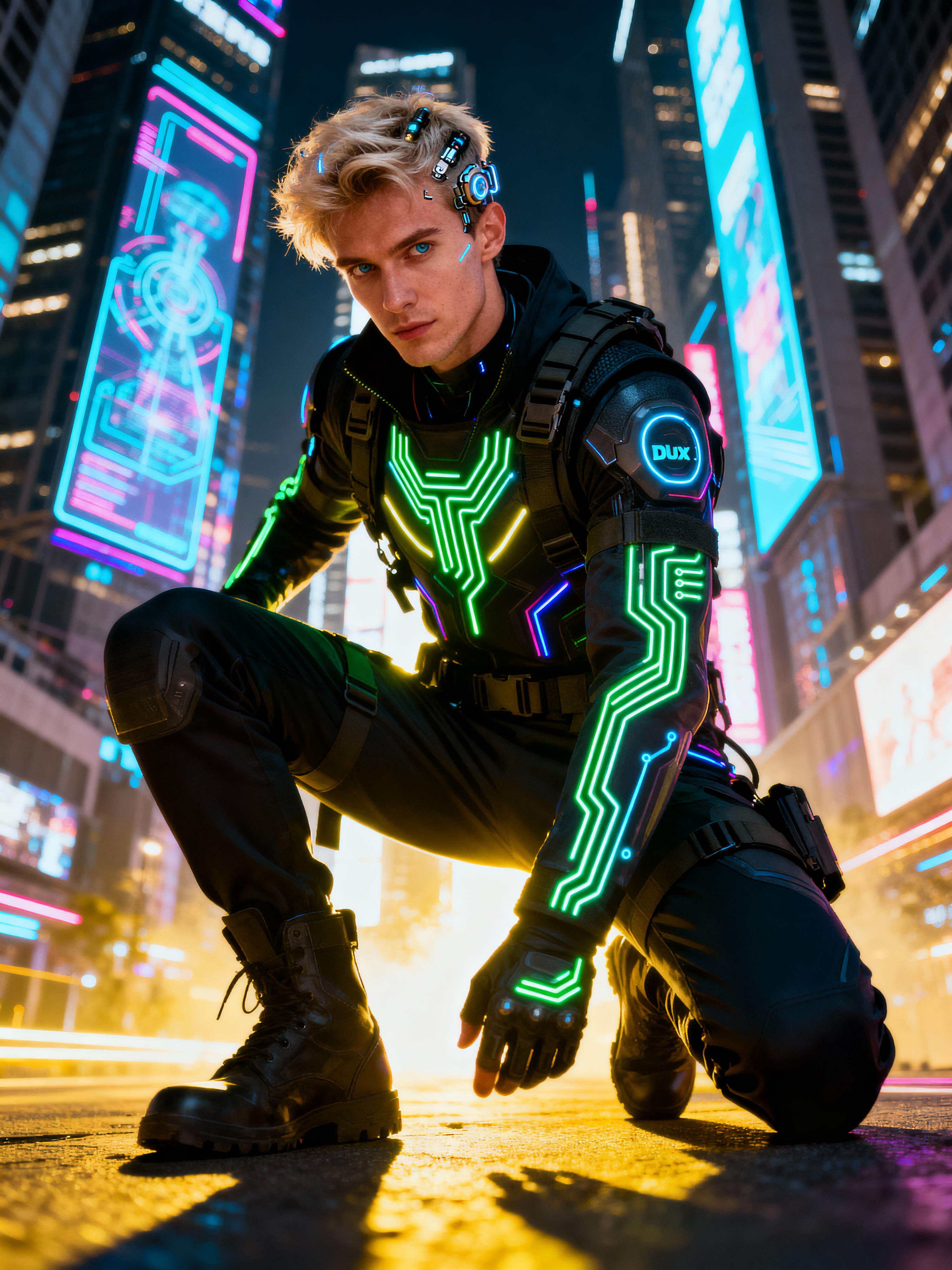 cosplayer model in a cyberpunk outfit, posing against the backdrop of bright city lights