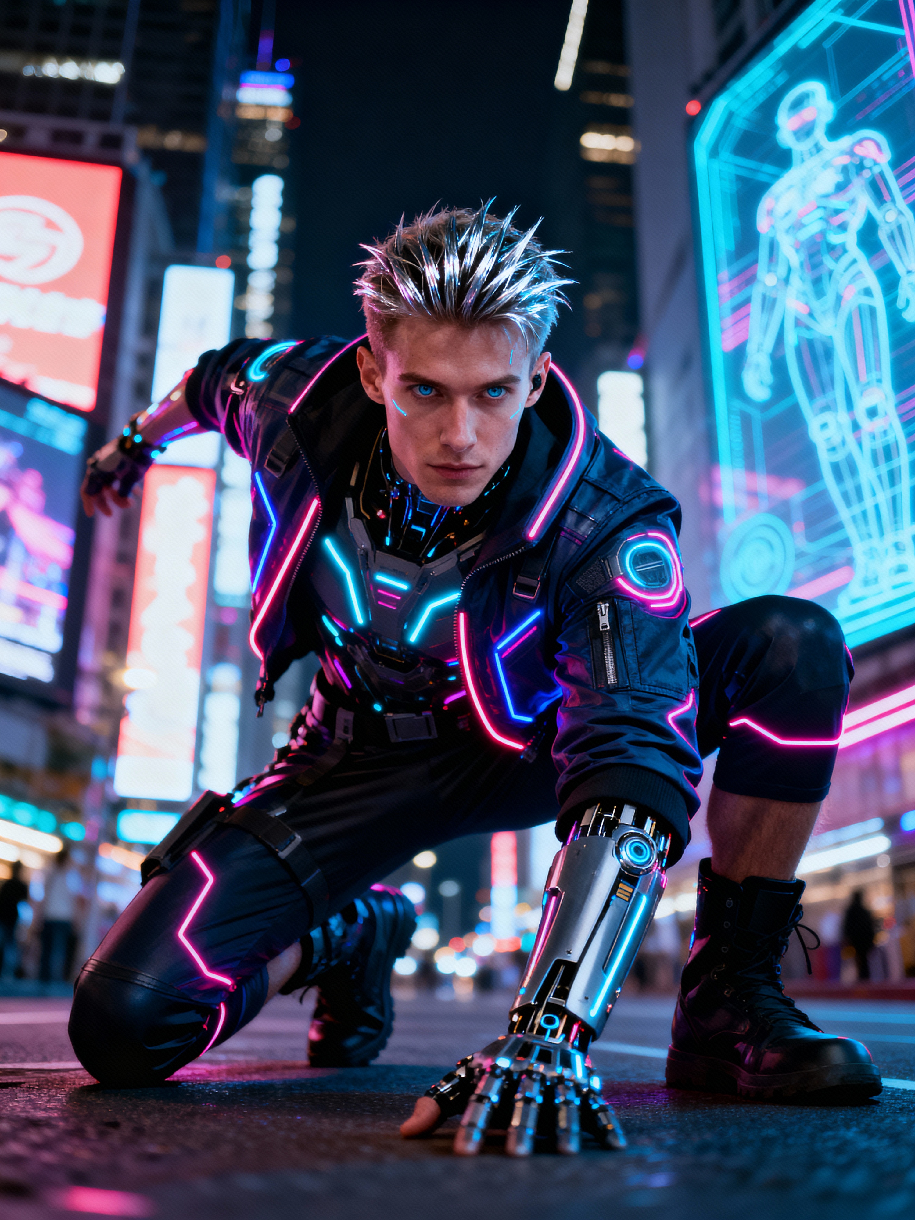 cosplayer model in a cyberpunk outfit, posing against the backdrop of bright city lights