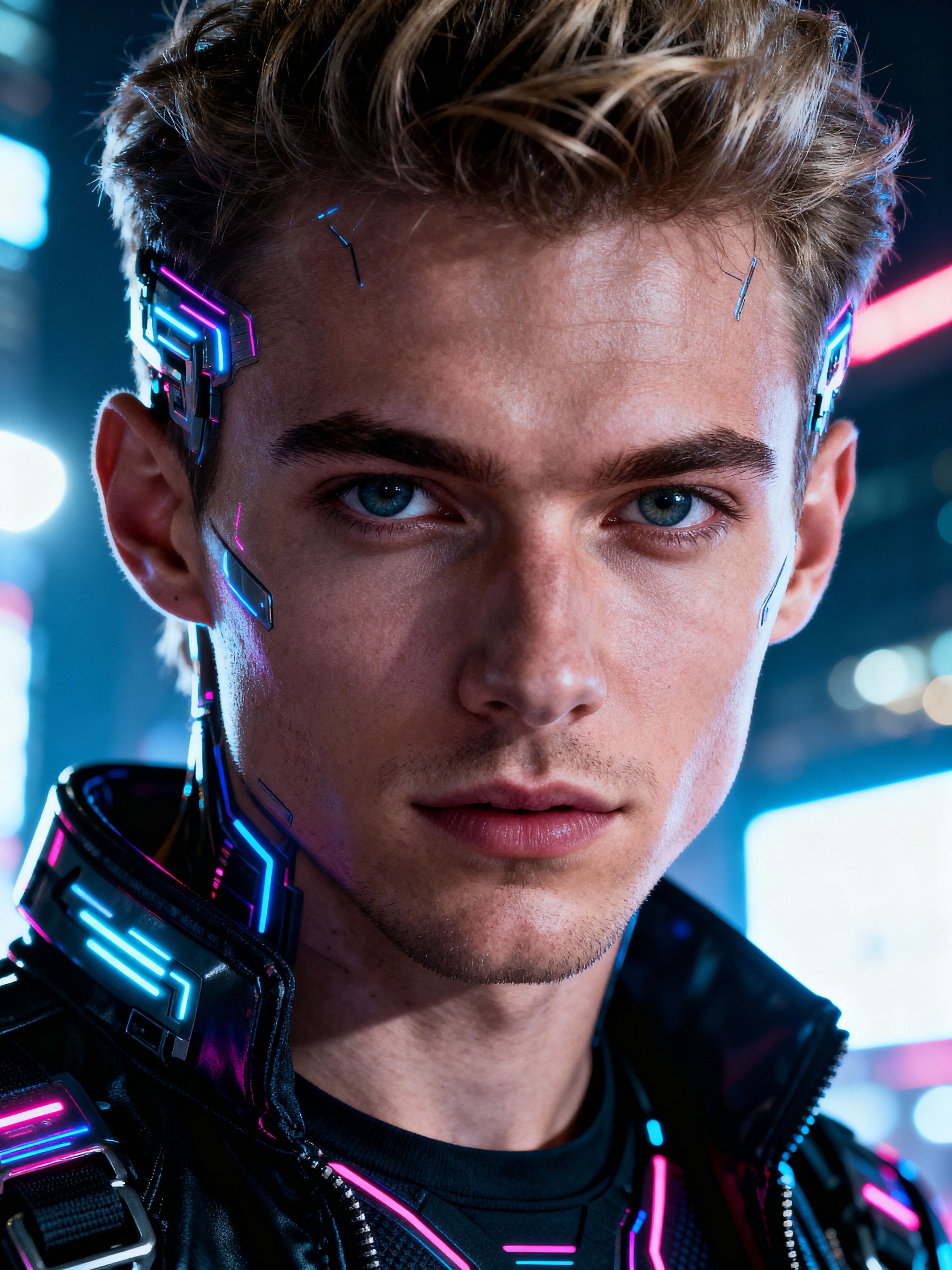 cosplayer model in a cyberpunk outfit, posing against the backdrop of bright city lights