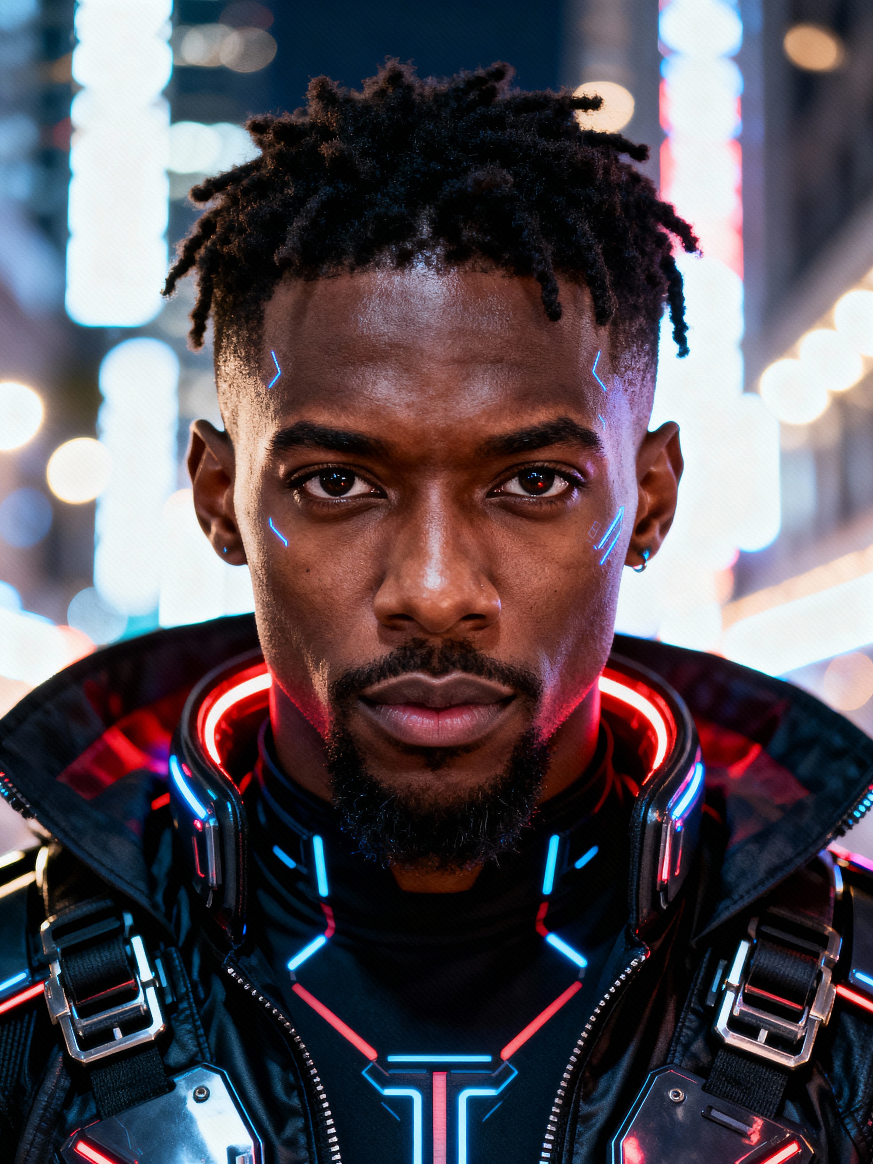 cosplayer model in a cyberpunk outfit, posing against the backdrop of bright city lights