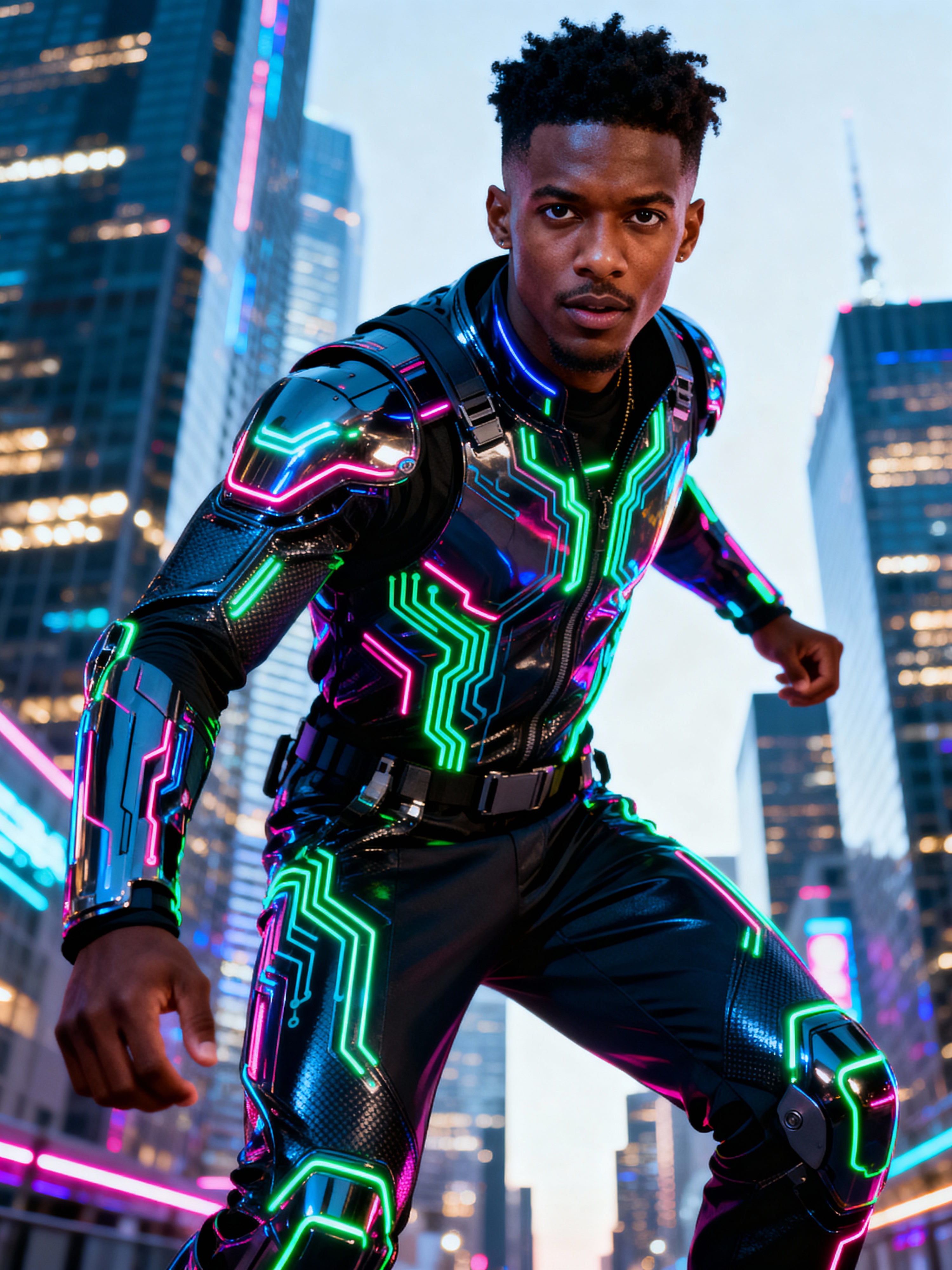 cosplayer model in a cyberpunk outfit, posing against the backdrop of bright city lights