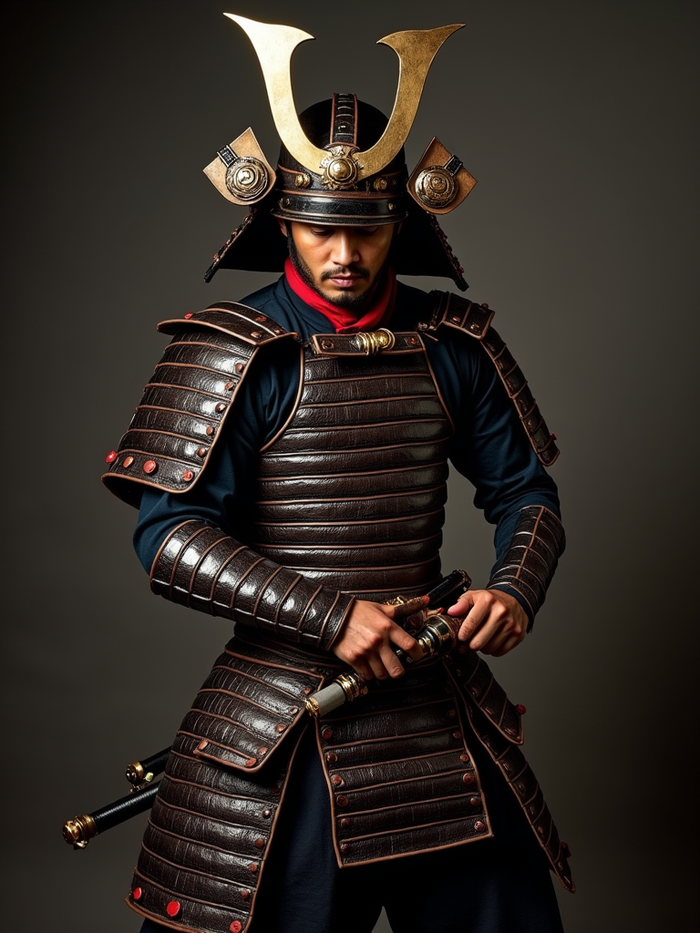 cosplayer model in a dynamic action pose, wearing a samurai armor with intricate details, studio lights and dramatic backdrop