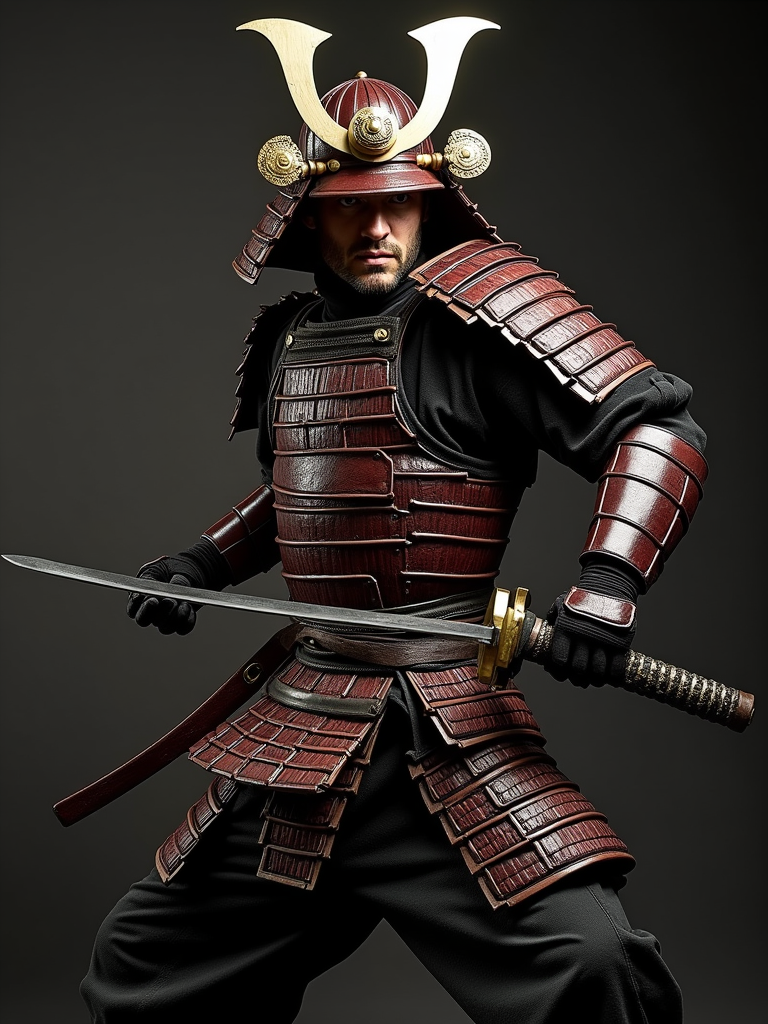 cosplayer model in a dynamic action pose, wearing a samurai armor with intricate details, studio lights and dramatic backdrop