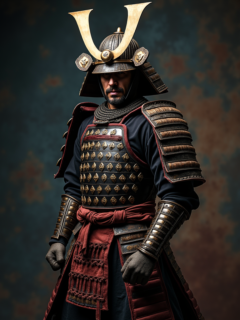 cosplayer model in a dynamic action pose, wearing a samurai armor with intricate details, studio lights and dramatic backdrop