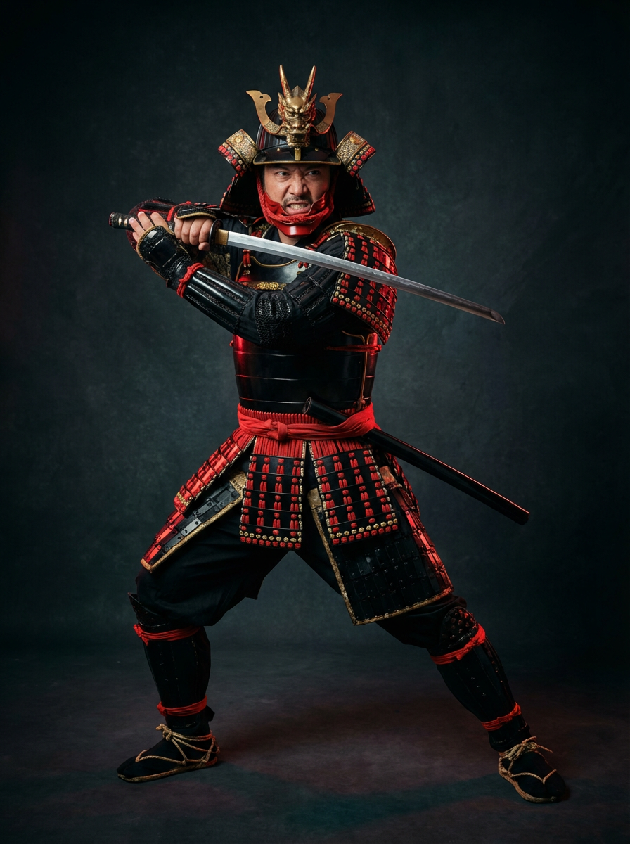 cosplayer model in a dynamic action pose, wearing a samurai armor with intricate details, studio lights and dramatic backdrop