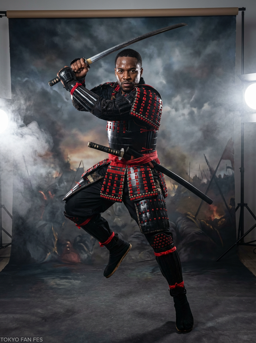 cosplayer model in a dynamic action pose, wearing a samurai armor with intricate details, studio lights and dramatic backdrop