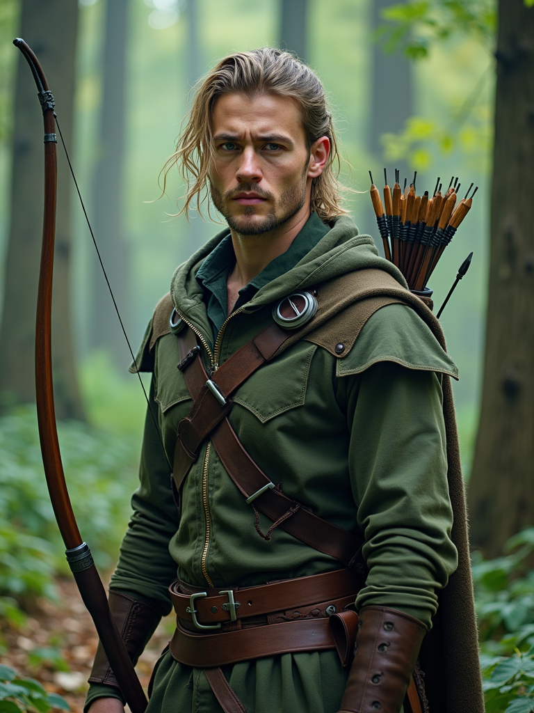 cosplayer model in a fantasy forest setting, wearing a ranger outfit with a bow and quiver, surrounded by magical effects and greenery