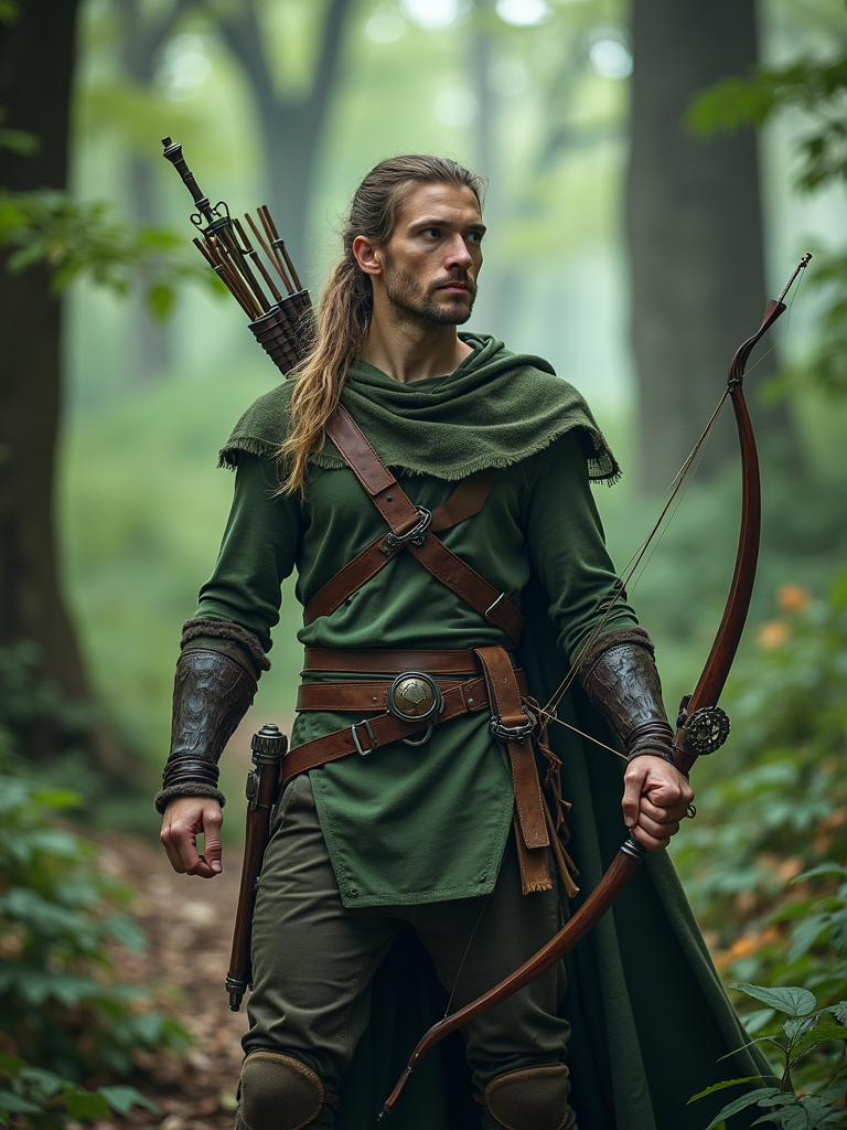 cosplayer model in a fantasy forest setting, wearing a ranger outfit with a bow and quiver, surrounded by magical effects and greenery