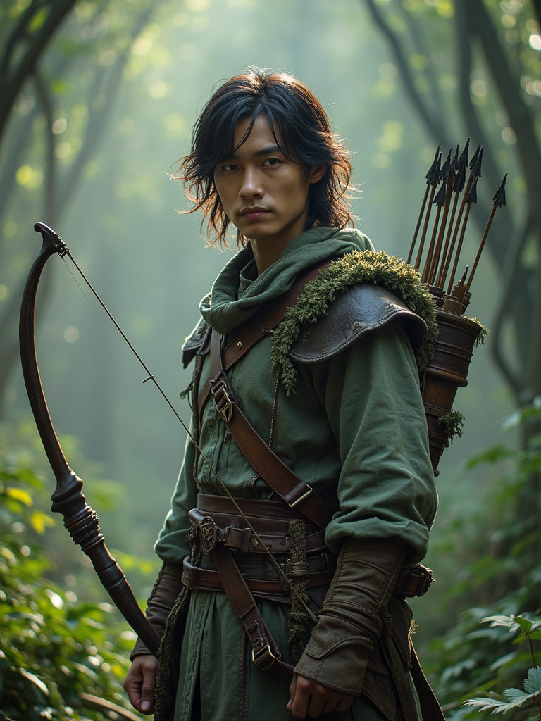cosplayer model in a fantasy forest setting, wearing a ranger outfit with a bow and quiver, surrounded by magical effects and greenery