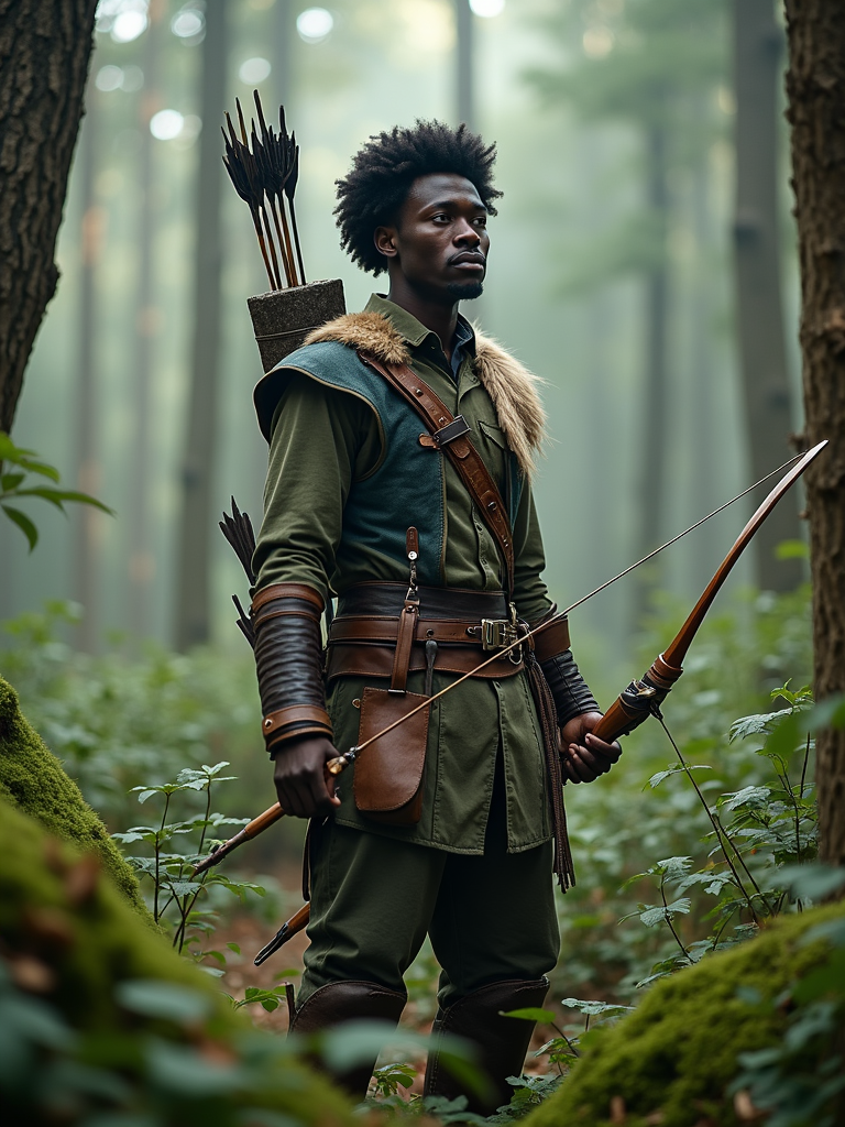 cosplayer model in a fantasy forest setting, wearing a ranger outfit with a bow and quiver, surrounded by magical effects and greenery