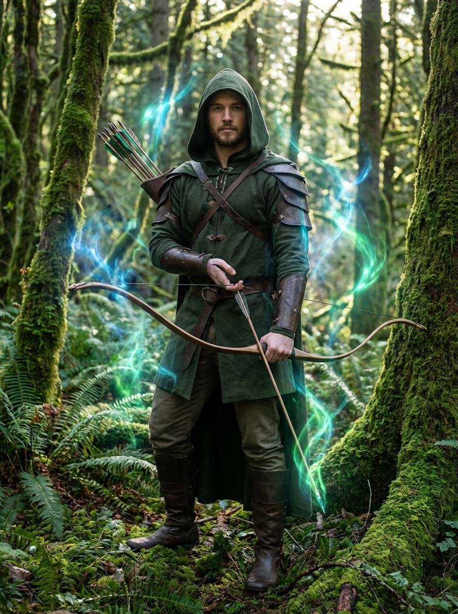 cosplayer model in a fantasy forest setting, wearing a ranger outfit with a bow and quiver, surrounded by magical effects and greenery