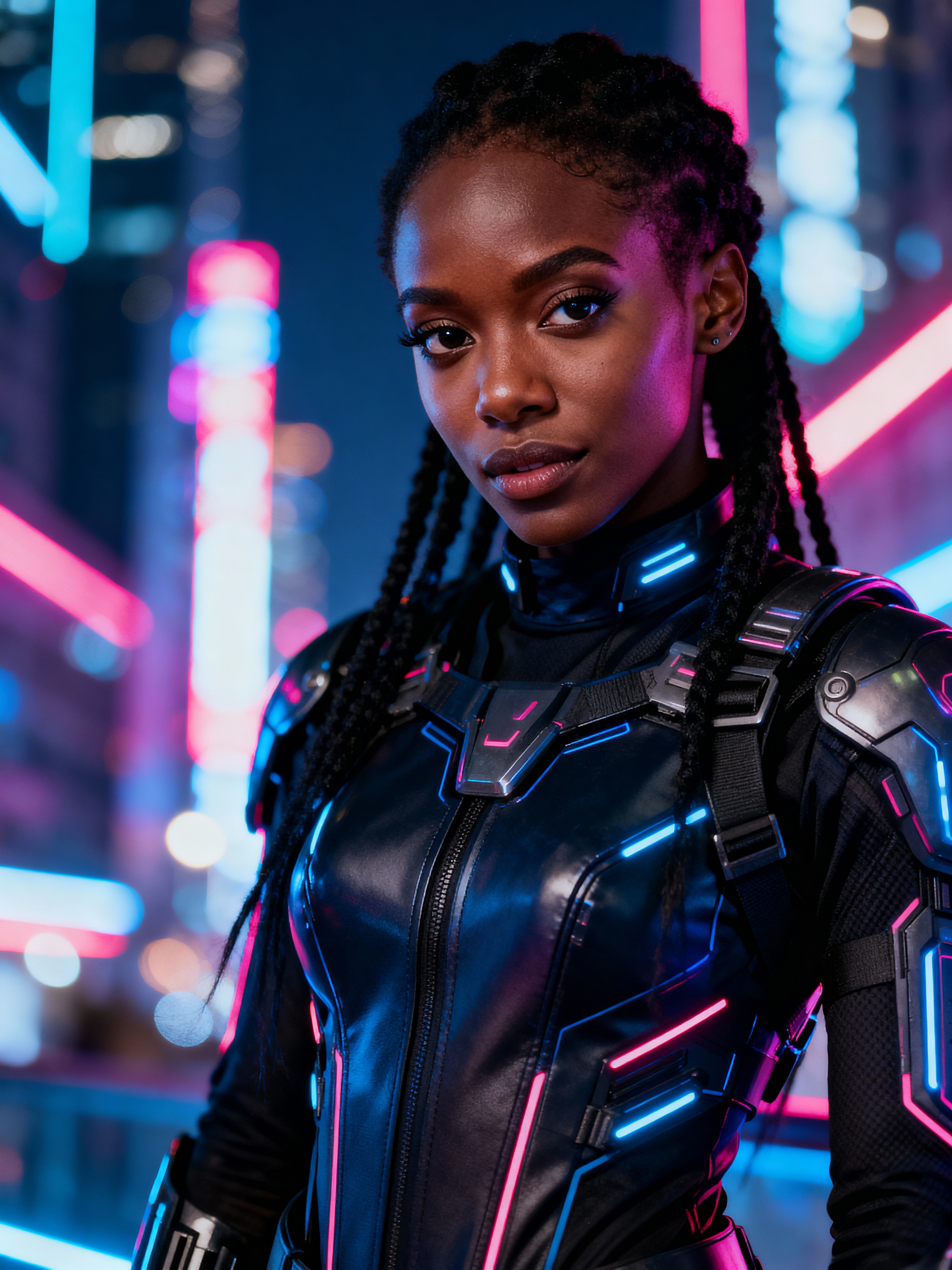 cosplayer model in a cyberpunk outfit, posing against the backdrop of bright city lights