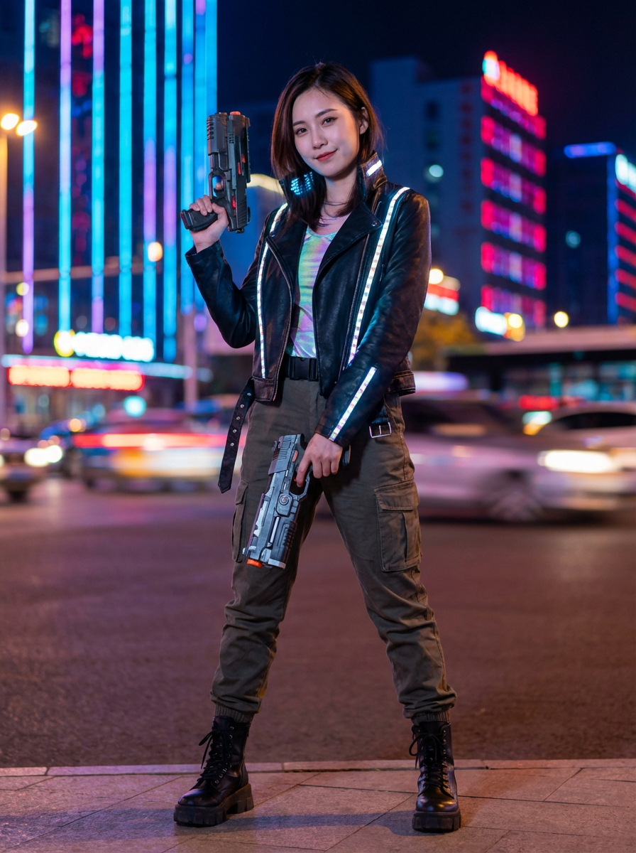 cosplayer model in a cyberpunk outfit, posing against the backdrop of bright city lights
