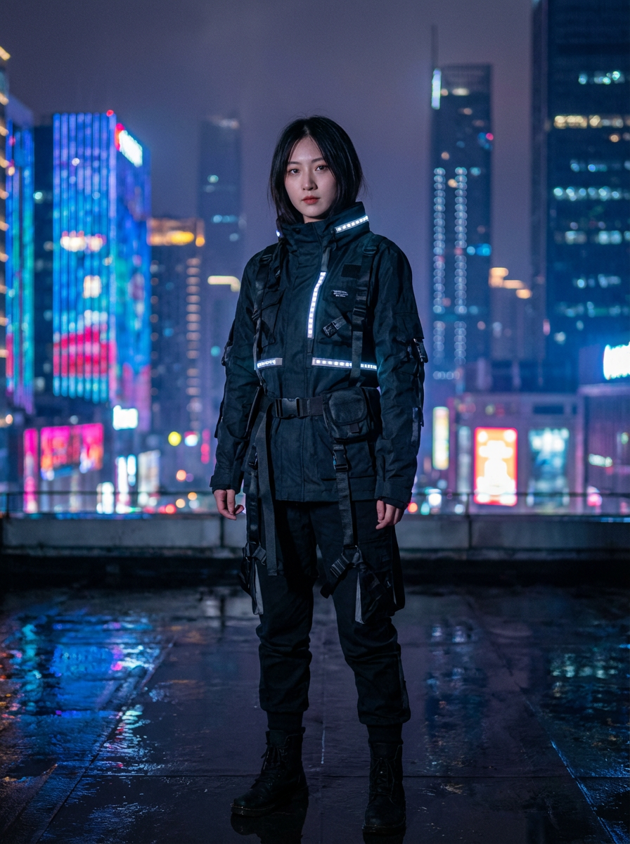 cosplayer model in a cyberpunk outfit, posing against the backdrop of bright city lights