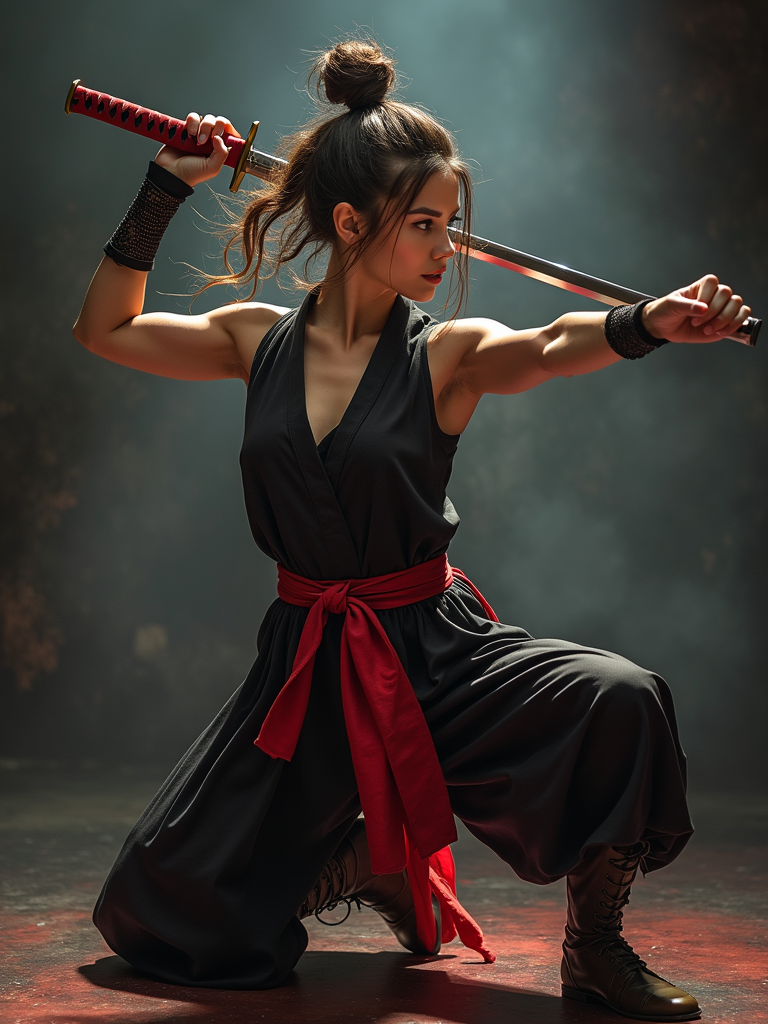cosplayer model in a dynamic action pose, wearing a ninja outfit with a katana and flowing sash , studio lights and dramatic backdrop