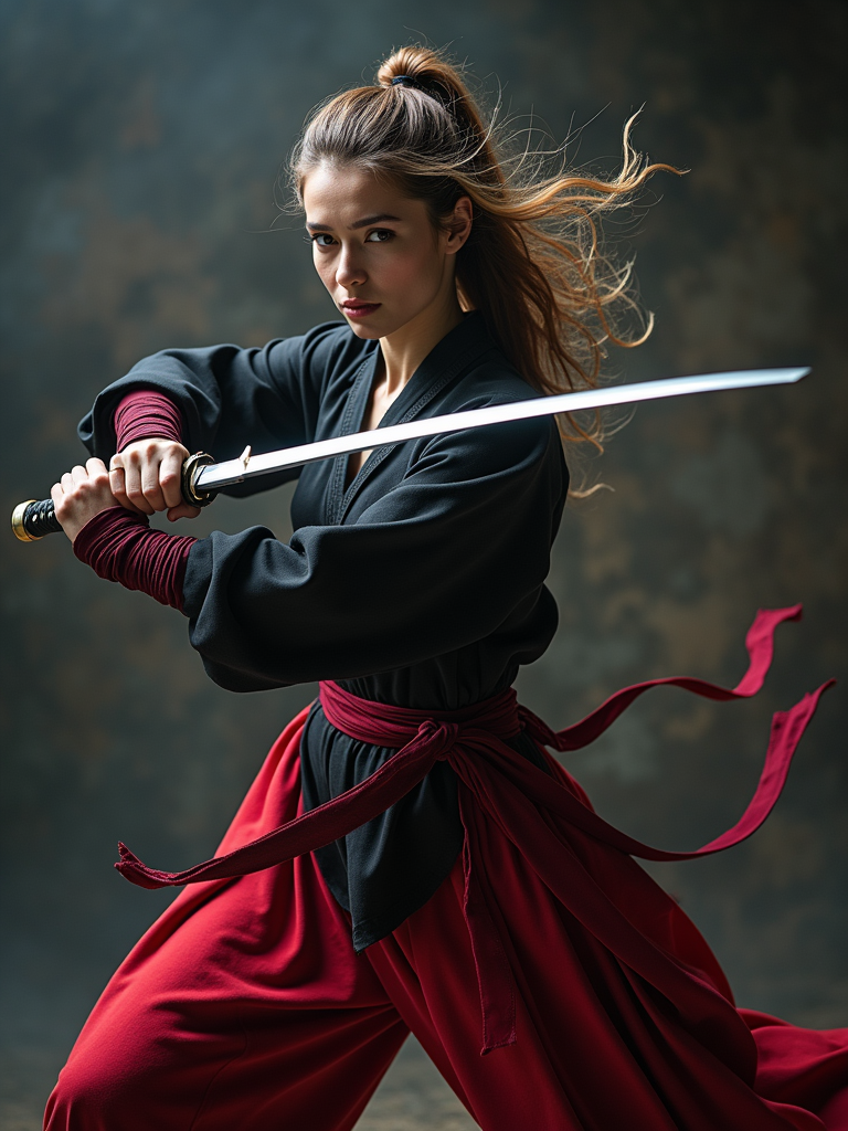 cosplayer model in a dynamic action pose, wearing a ninja outfit with a katana and flowing sash , studio lights and dramatic backdrop