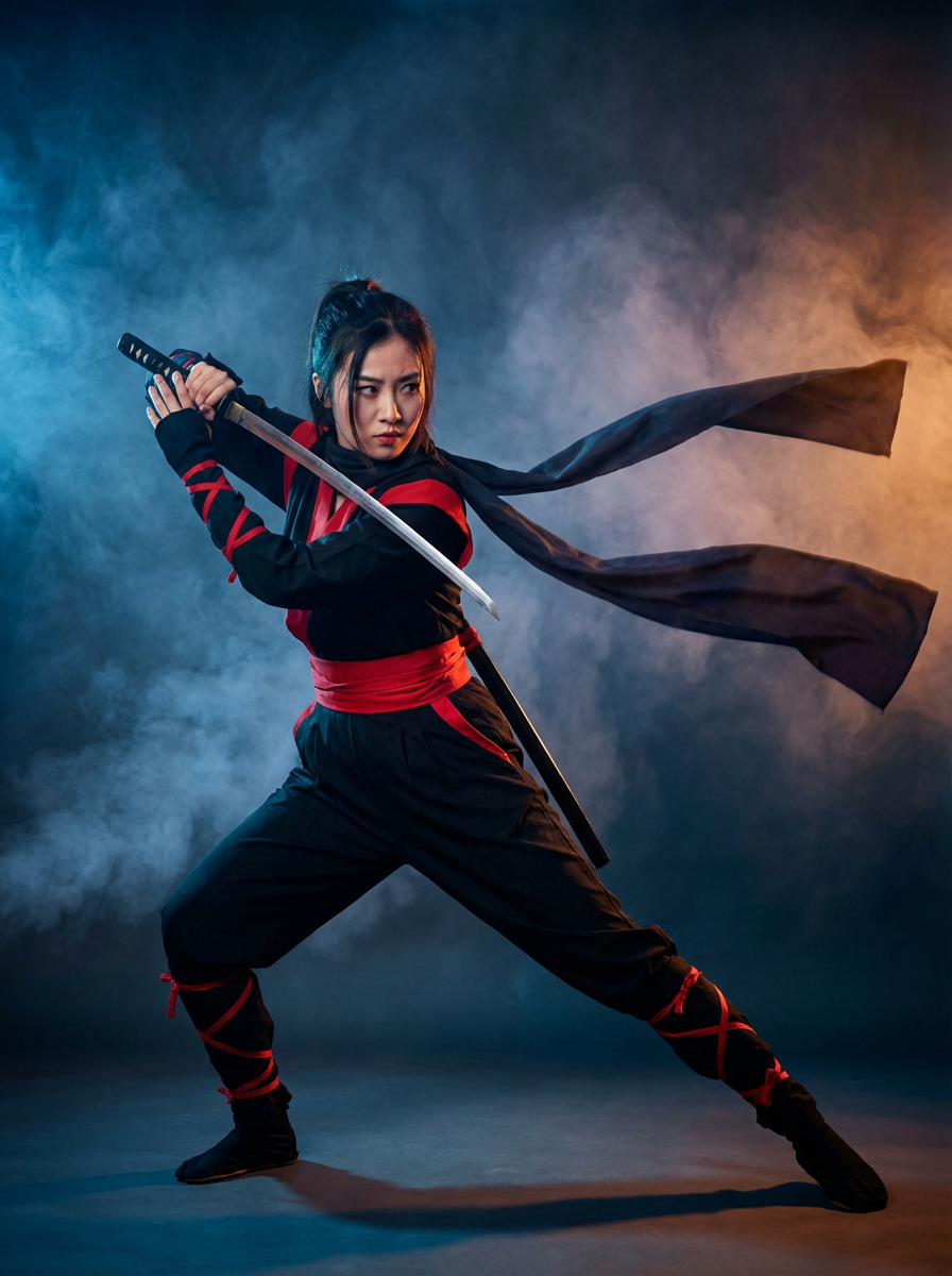 cosplayer model in a dynamic action pose, wearing a ninja outfit with a katana and flowing sash , studio lights and dramatic backdrop