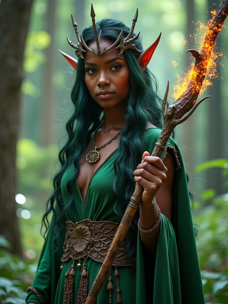 cosplayer model in a fantasy forest setting, wearing a mystical elf costume with a glowing staff , surrounded by magical effects and greenery