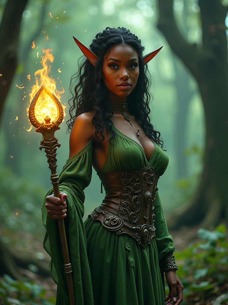 cosplayer model in a fantasy forest setting, wearing a mystical elf costume with a glowing staff , surrounded by magical effects and greenery