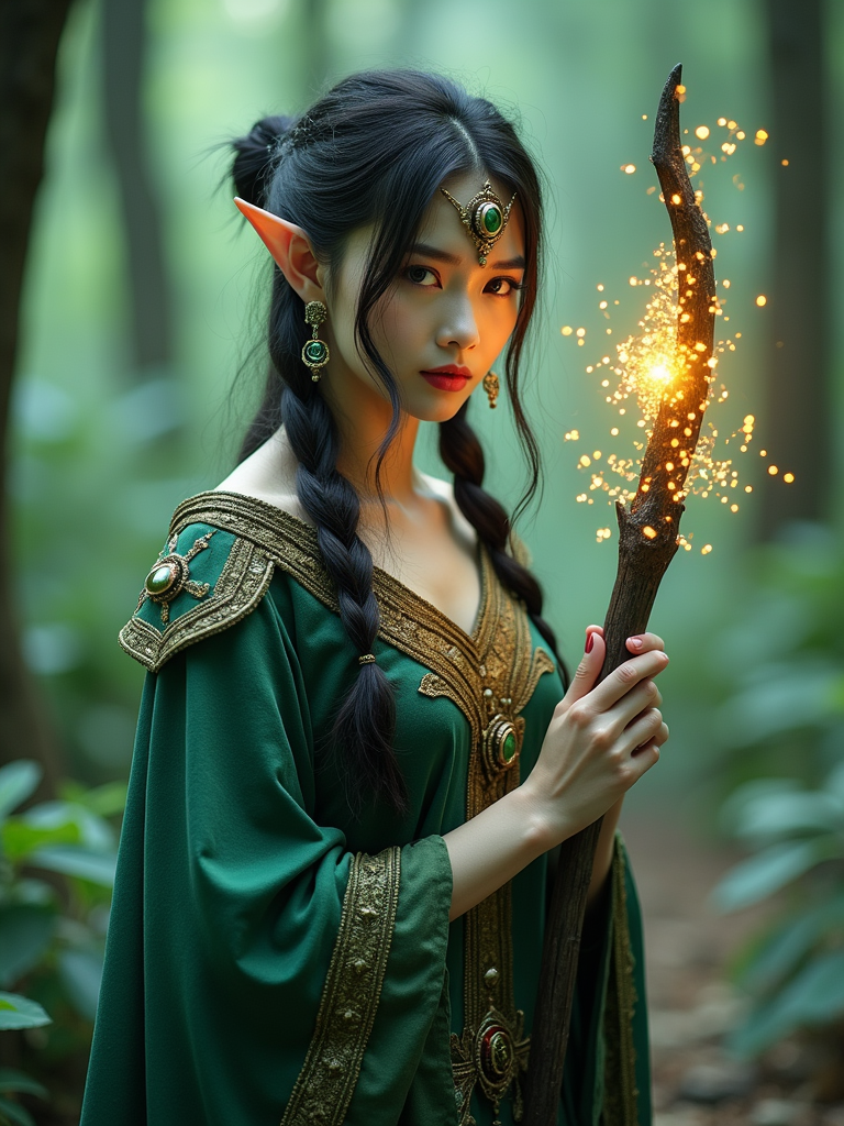cosplayer model in a fantasy forest setting, wearing a mystical elf costume with a glowing staff , surrounded by magical effects and greenery