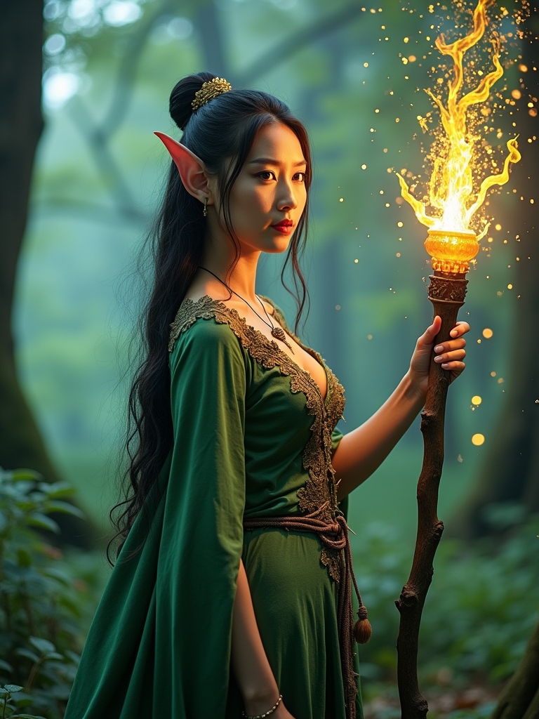 cosplayer model in a fantasy forest setting, wearing a mystical elf costume with a glowing staff , surrounded by magical effects and greenery