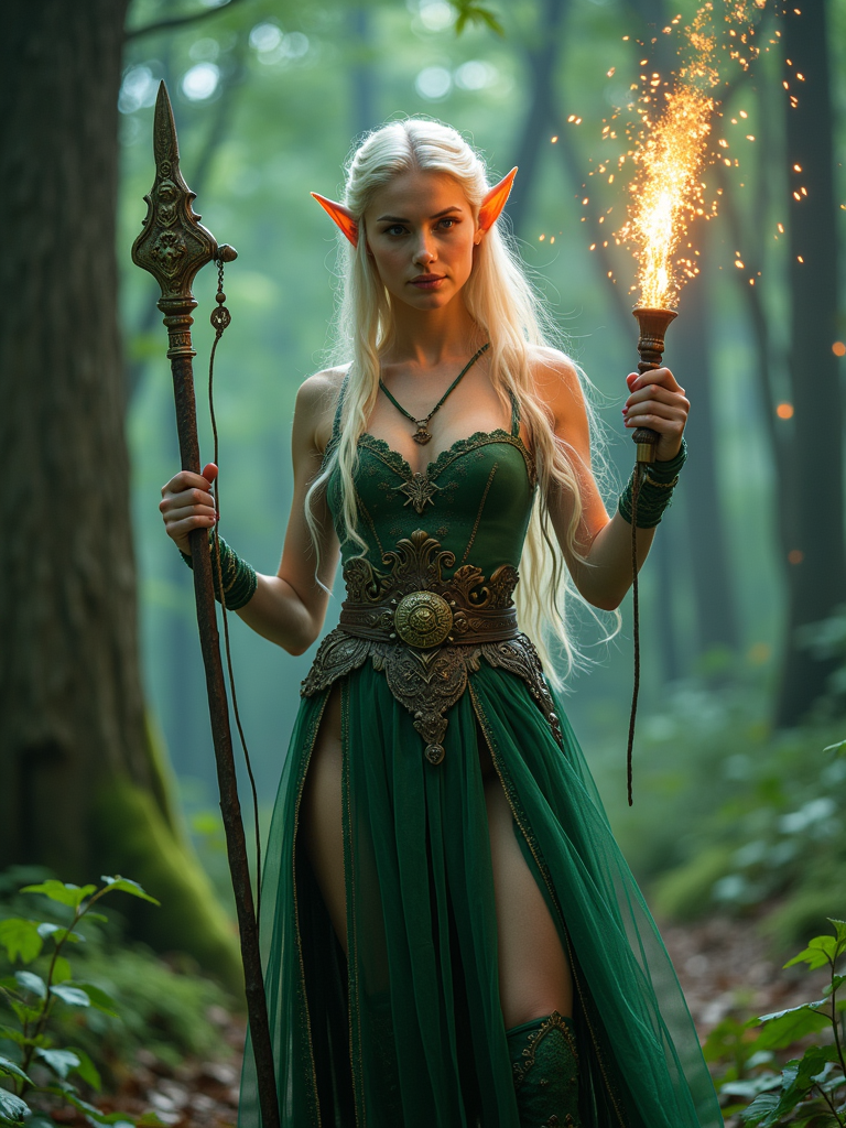 cosplayer model in a fantasy forest setting, wearing a mystical elf costume with a glowing staff , surrounded by magical effects and greenery