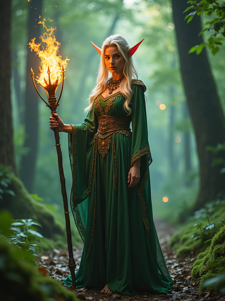 cosplayer model in a fantasy forest setting, wearing a mystical elf costume with a glowing staff , surrounded by magical effects and greenery