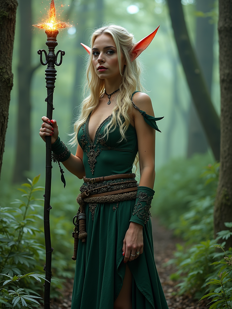 cosplayer model in a fantasy forest setting, wearing a mystical elf costume with a glowing staff , surrounded by magical effects and greenery