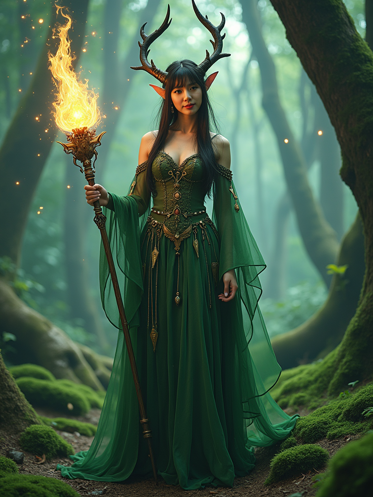 cosplayer model in a fantasy forest setting, wearing a mystical elf costume with a glowing staff , surrounded by magical effects and greenery