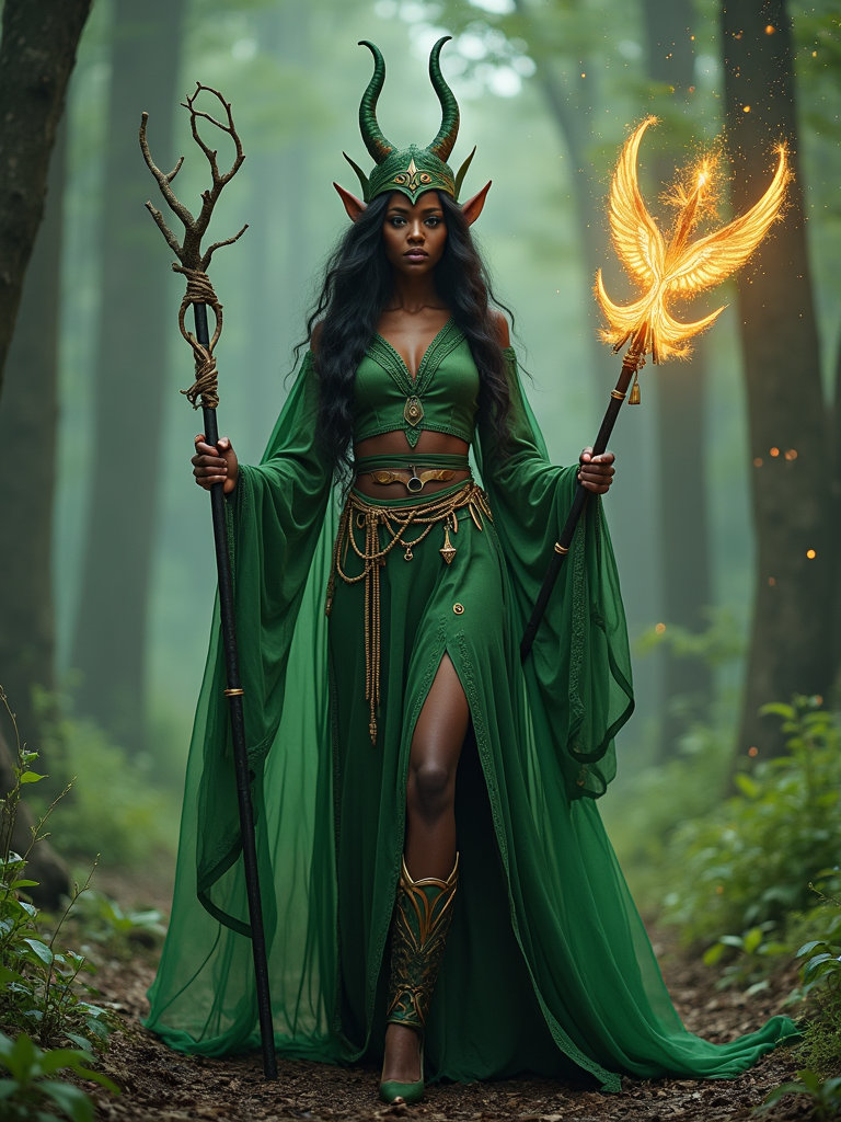 cosplayer model in a fantasy forest setting, wearing a mystical elf costume with a glowing staff , surrounded by magical effects and greenery