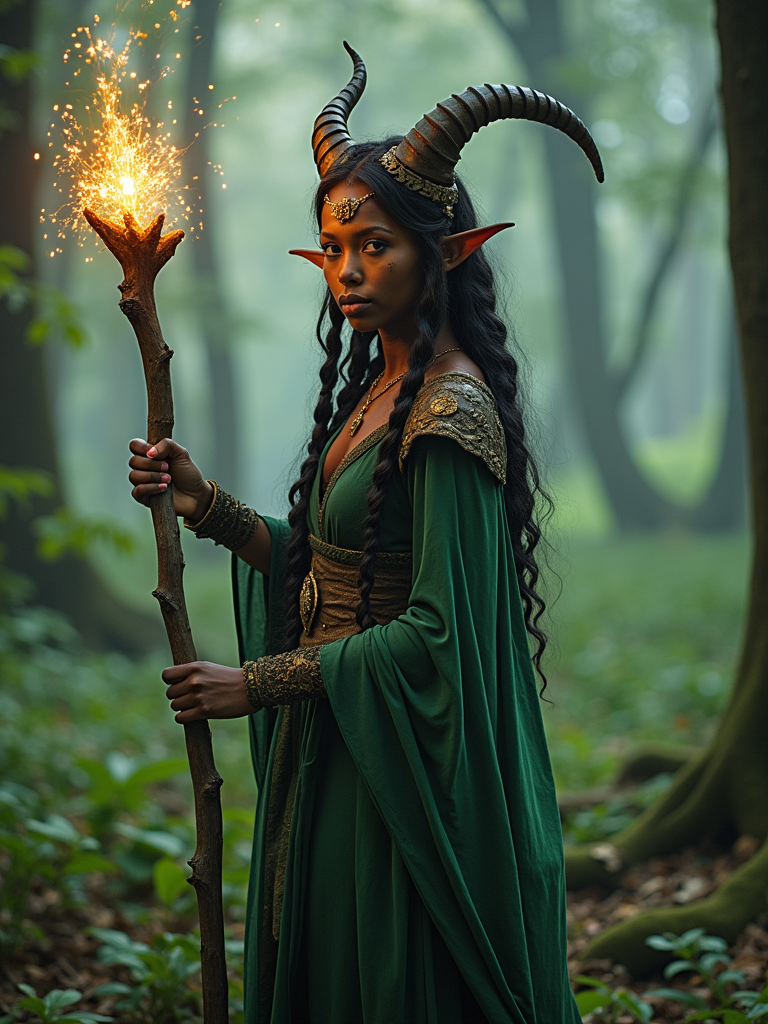 cosplayer model in a fantasy forest setting, wearing a mystical elf costume with a glowing staff , surrounded by magical effects and greenery