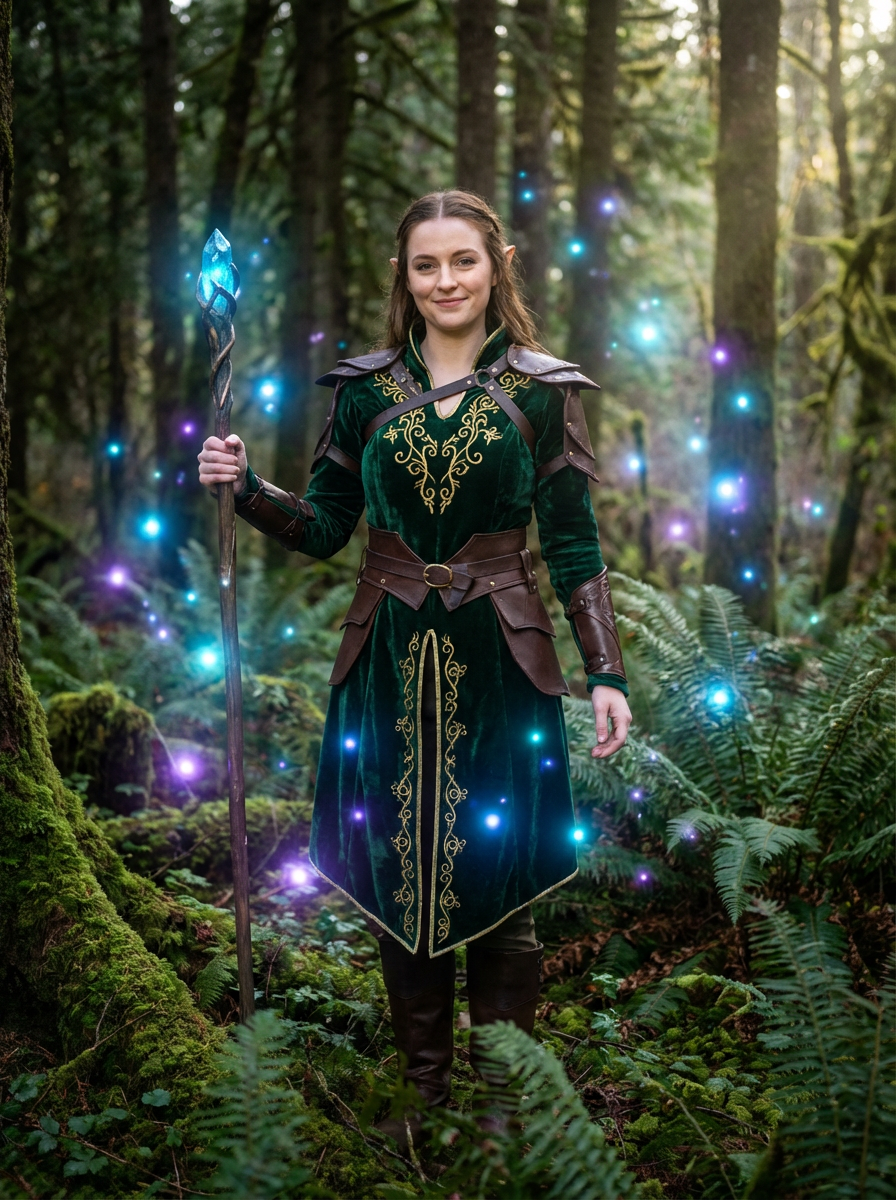 cosplayer model in a fantasy forest setting, wearing a mystical elf costume with a glowing staff , surrounded by magical effects and greenery
