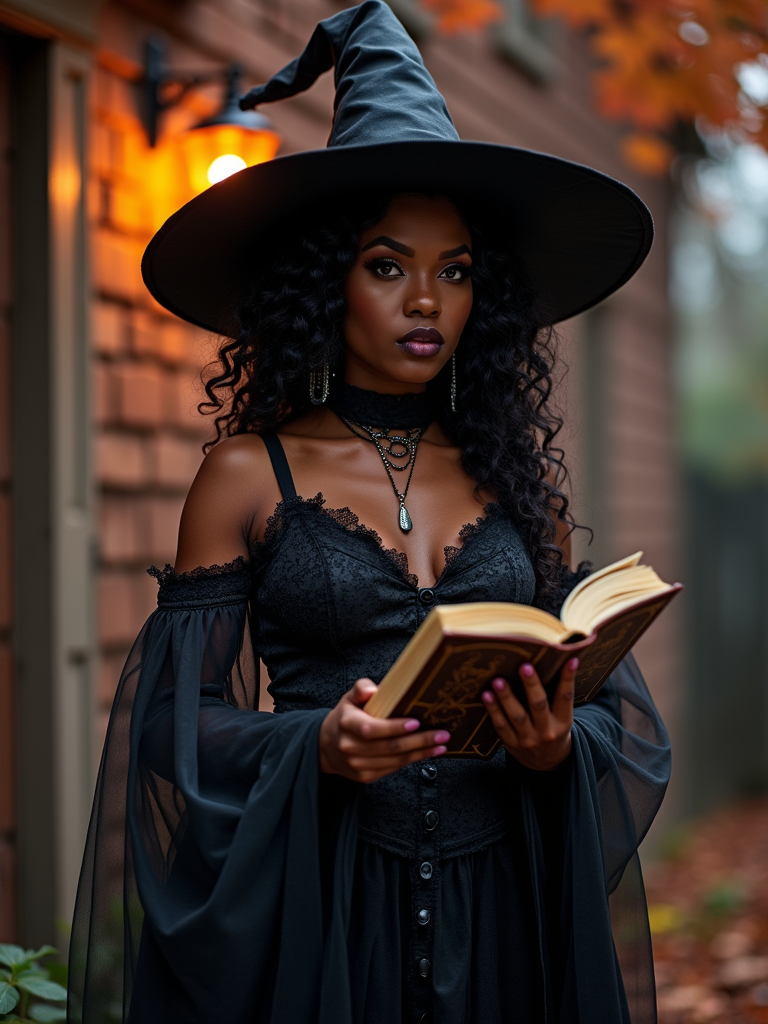 cosplayer model in a Halloween-themed cosplay, haunted house backdrop, wearing a gothic witch outfit with a spellbook , spooky lighting and props