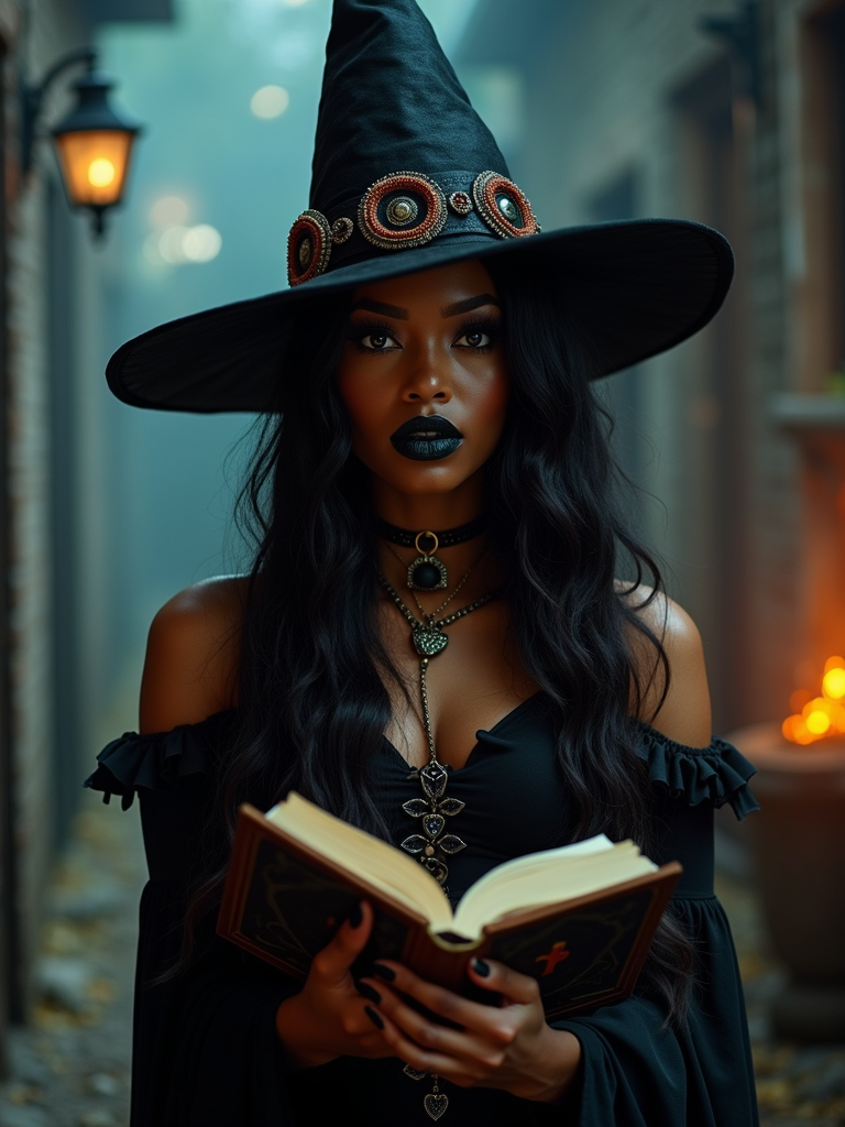 cosplayer model in a Halloween-themed cosplay, haunted house backdrop, wearing a gothic witch outfit with a spellbook , spooky lighting and props