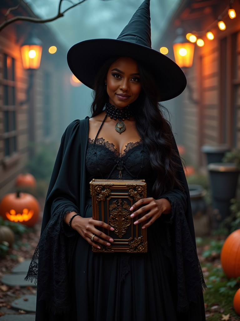 cosplayer model in a Halloween-themed cosplay, haunted house backdrop, wearing a gothic witch outfit with a spellbook , spooky lighting and props