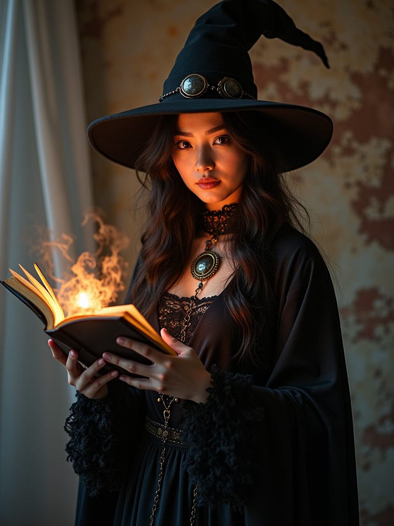 cosplayer model in a Halloween-themed cosplay, haunted house backdrop, wearing a gothic witch outfit with a spellbook , spooky lighting and props