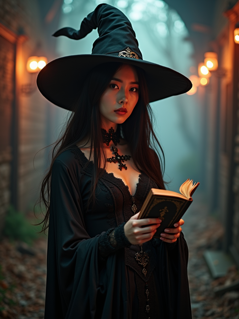 cosplayer model in a Halloween-themed cosplay, haunted house backdrop, wearing a gothic witch outfit with a spellbook , spooky lighting and props