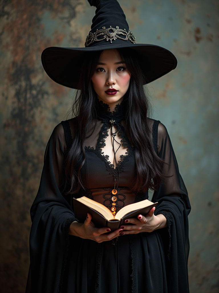 cosplayer model in a Halloween-themed cosplay, haunted house backdrop, wearing a gothic witch outfit with a spellbook , spooky lighting and props
