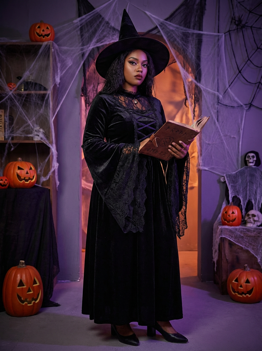cosplayer model in a Halloween-themed cosplay, haunted house backdrop, wearing a gothic witch outfit with a spellbook , spooky lighting and props