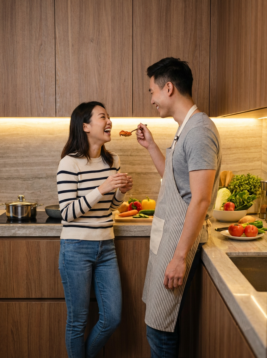couple photo of model and boyfriend cooking together in modern kitchen, playful moment, casual home attire, warm lighting