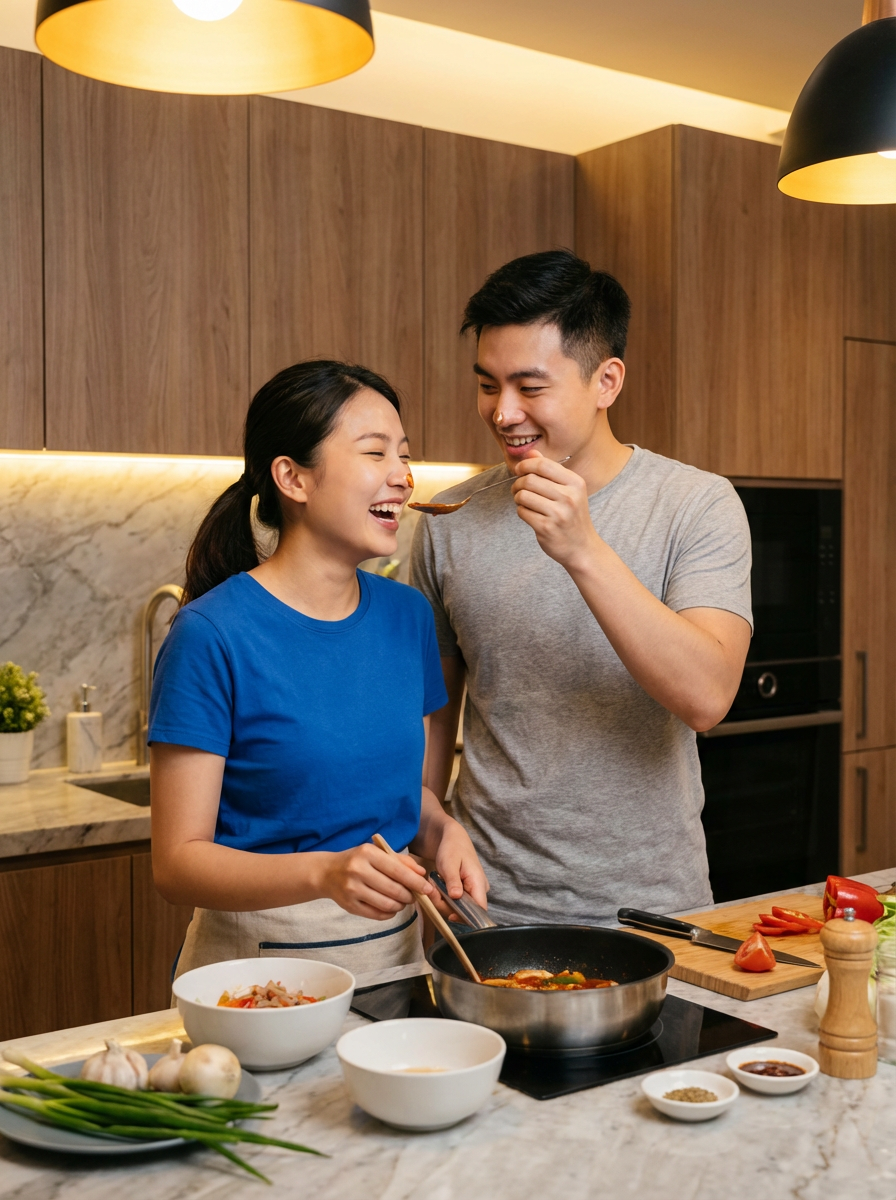 couple photo of model and boyfriend cooking together in modern kitchen, playful moment, casual home attire, warm lighting