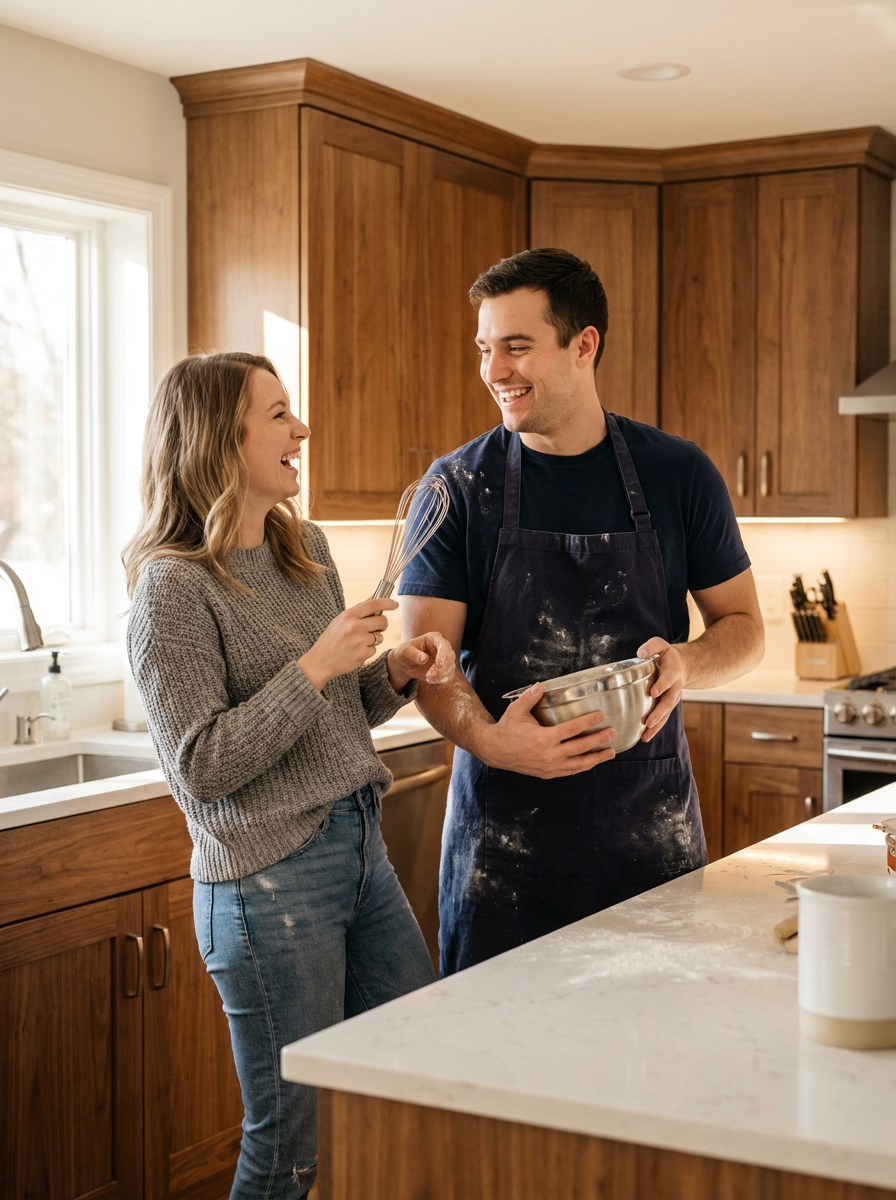 couple photo of model and boyfriend cooking together in modern kitchen, playful moment, casual home attire, warm lighting