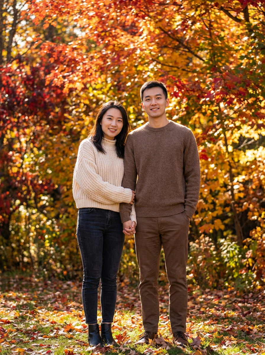 couple portrait of model and boyfriend in autumn park, cozy sweaters, fall foliage background, warm natural light