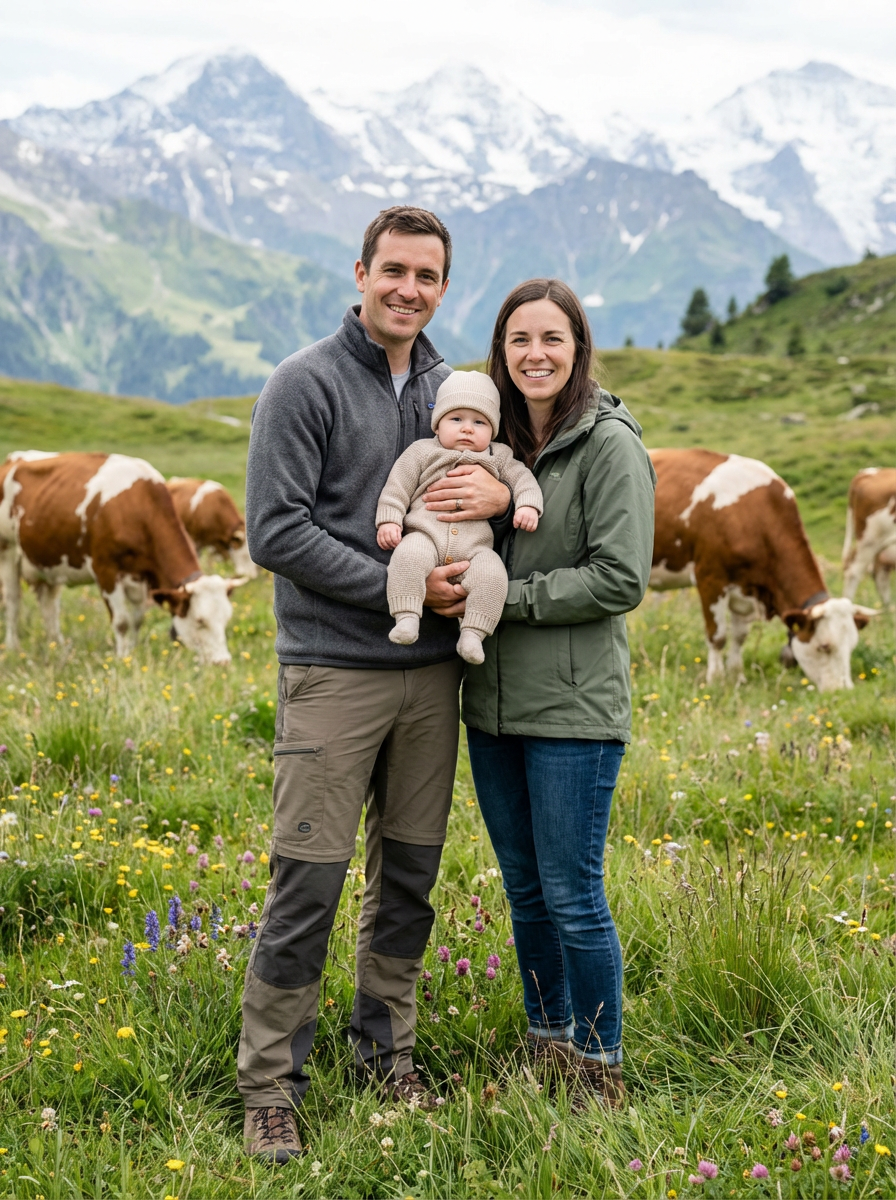 couple portrait with baby in Swiss mountain meadow with grazing cows, everyone wearing casual hiking outfits, alpine grass and wildflowers, snow-capped peaks in background, traditional Swiss cows nearby, fresh mountain air atmosphere, natural alpine lighting, peaceful countryside setting
