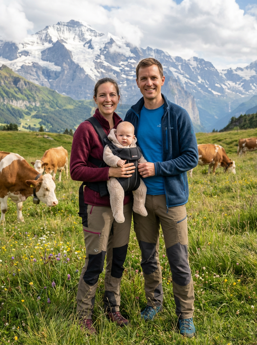 couple portrait with baby in Swiss mountain meadow with grazing cows, everyone wearing casual hiking outfits, alpine grass and wildflowers, snow-capped peaks in background, traditional Swiss cows nearby, fresh mountain air atmosphere, natural alpine lighting, peaceful countryside setting