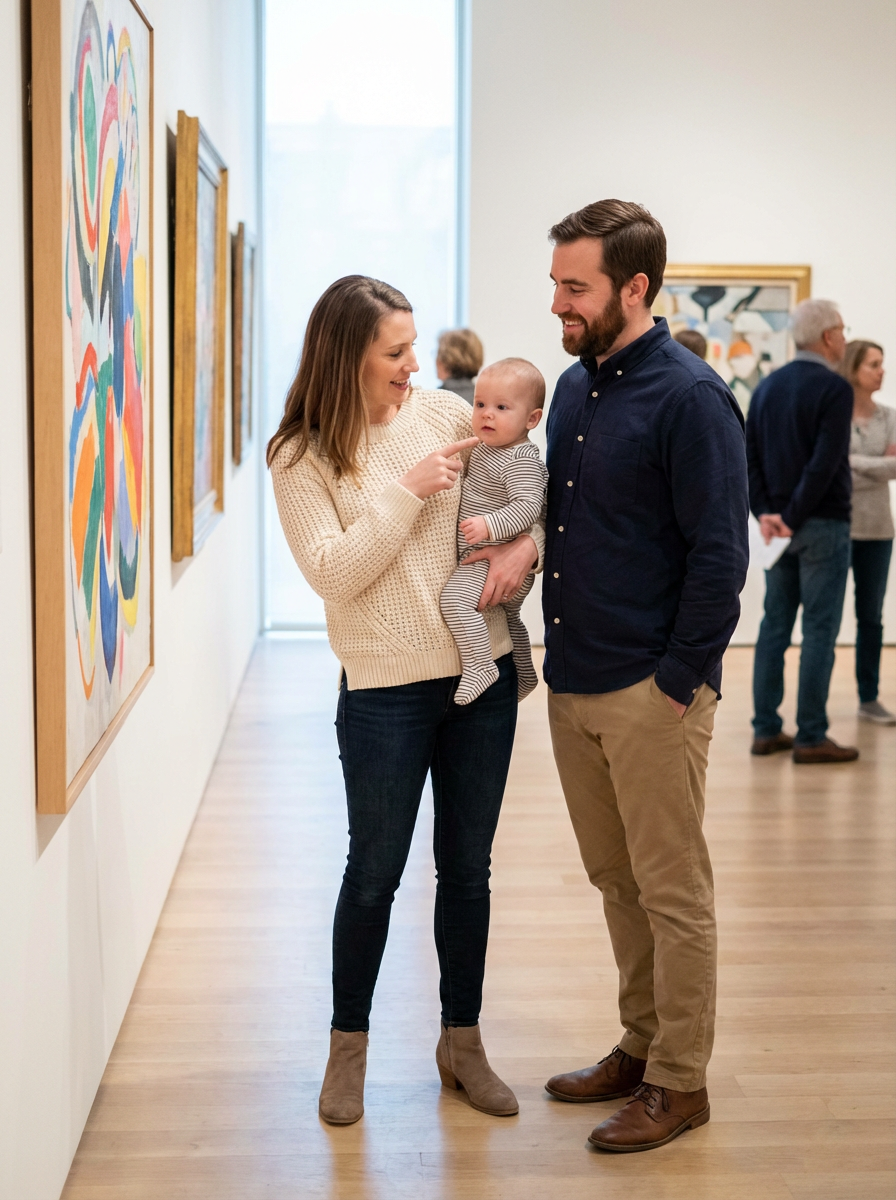 couple with baby at art museum, everyone wearing nice casual outfits, artwork in background, parents introducing baby to culture and creativity, sophisticated family education