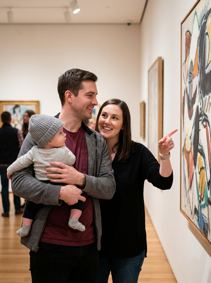 couple with baby at art museum, everyone wearing nice casual outfits, artwork in background, parents introducing baby to culture and creativity, sophisticated family education