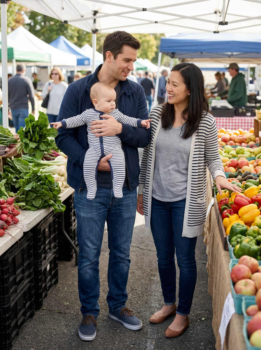 couple with baby at farmers market, everyone wearing casual weekend outfits, market stalls background, family selecting fresh produce together, teaching baby about healthy eating
