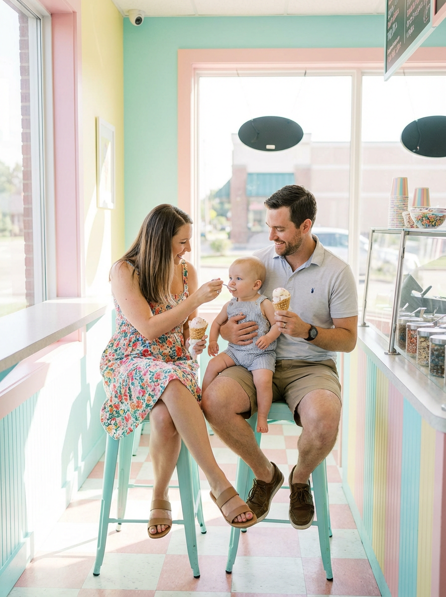 couple with baby at ice cream shop, everyone wearing summer clothes, colorful shop interior, family with baby enjoying ice cream, sweet family treat moment